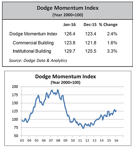 The Momentum Index, the monthly measure of the amount of non-residential projects in planning, showed a second consecutive month of growth in January. It also indicates that the institutional sector is "more robust than that of commercial," with over 14 percent growth in 2015.